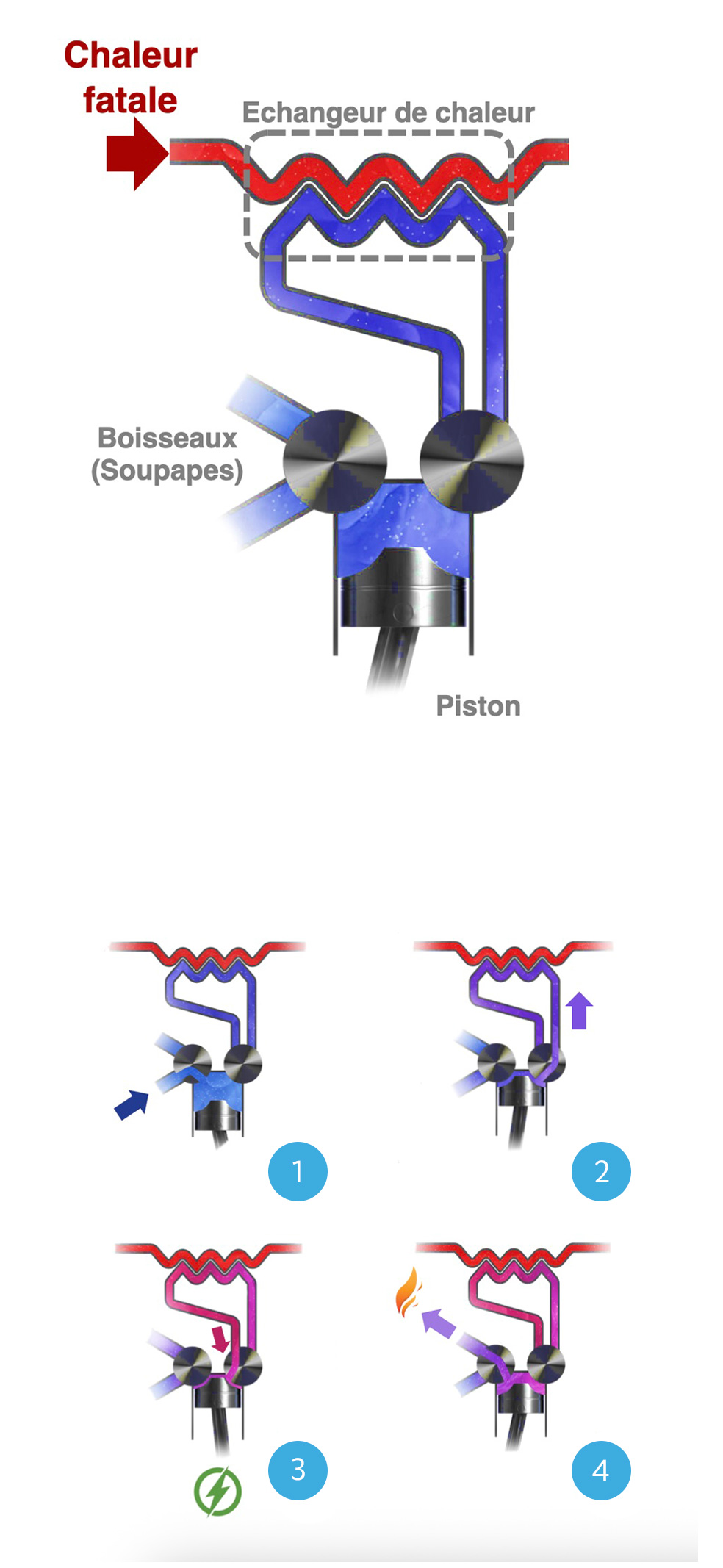 Une fois dans l’échangeur, l’air préalablement comprimé par le piston s’échauffe encore et monte en pression en prélevant des calories sur le gisement de chaleur fatale.